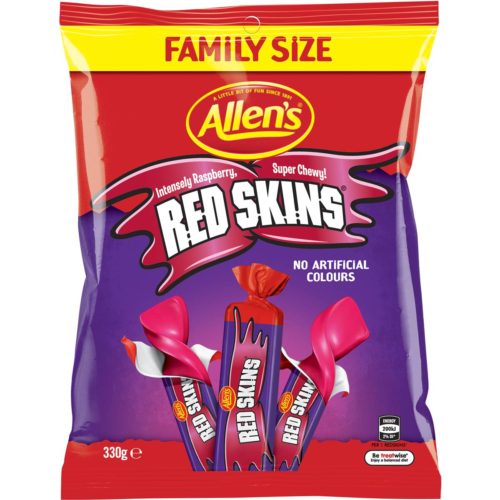 Add a splash of red to your day with Allens Red Ripperz Redskins Raspberry Candy – a delightful treat that brings joy with every bite.