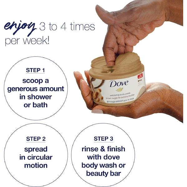Reveal smoother, softer, and radiant skin with Dove Exfoliating Body Scrub Brown Sugar & Coconut Butter Cream. This luxurious body scrub combines the natural exfoliating power of brown sugar crystals with the nourishing benefits of coconut butter and Dove’s signature ¼ moisturizing cream, leaving your skin refreshed, silky, and deeply hydrated.