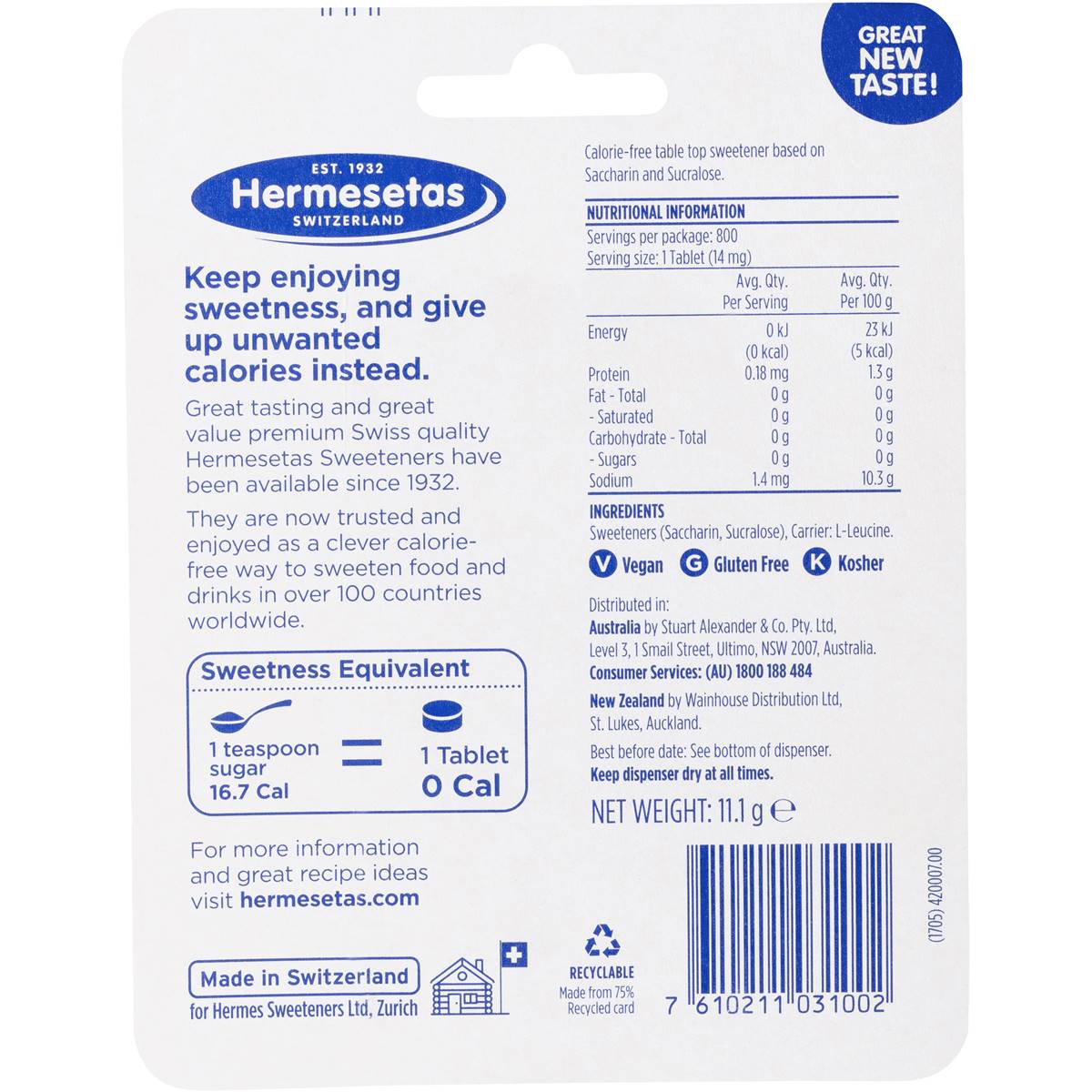 Elevate your sweetening options with Hermesetas Zero Calorie Mini Sweetener Tablets. This 800-pack offers a convenient supply of mini sweetener tablets, providing a simple way to add sweetness to your beverages and recipes without the calories. Crafted to provide a balance between taste enhancement and calorie-consciousness, these tablets are perfect for those who are looking to reduce their sugar intake. Whether you’re sweetening your coffee or tea, Hermesetas Zero Calorie Mini Sweetener Tablets bring a sense of satisfaction and flexibility to every use. Embrace the guilt-free sweetness and make mindful choices for your culinary creations.