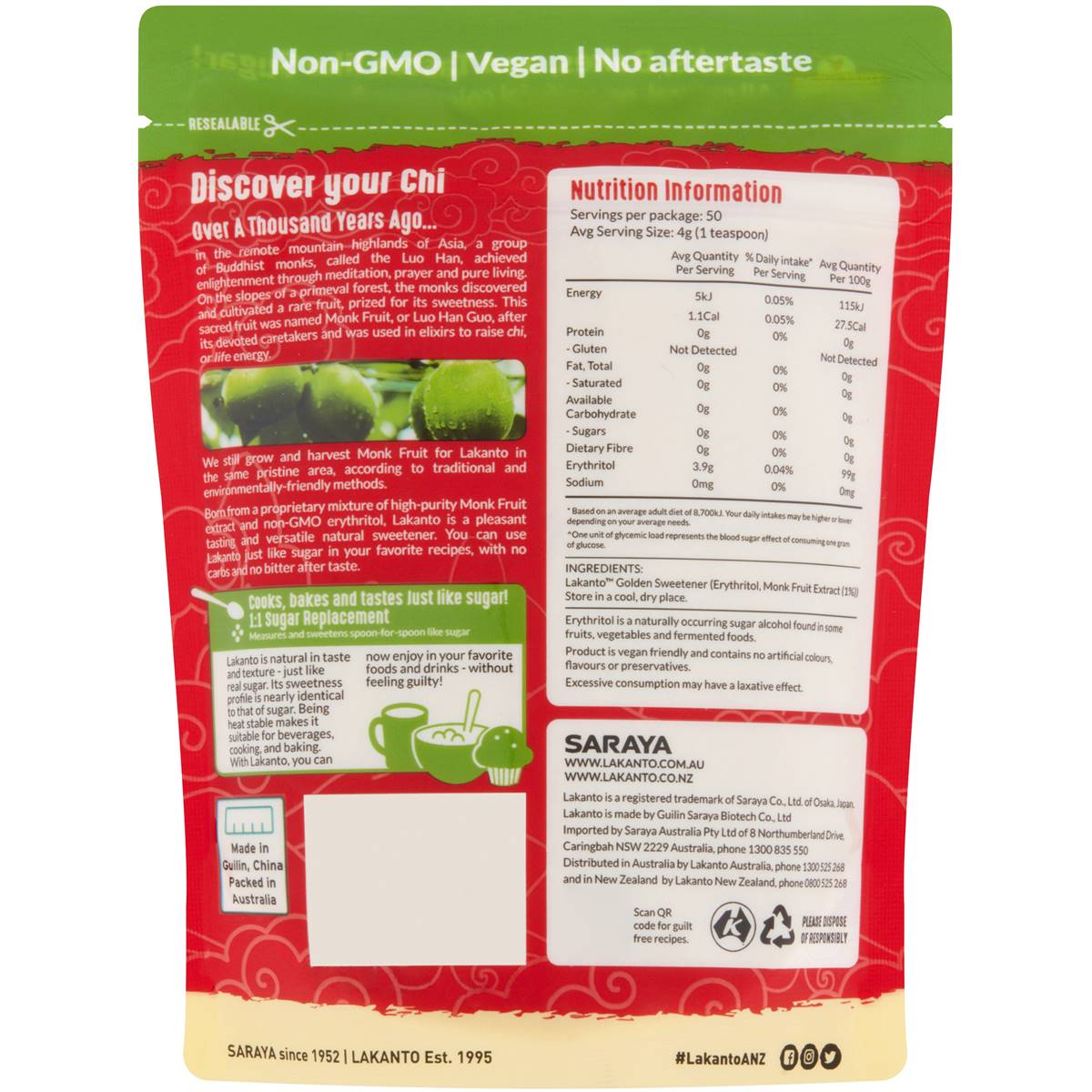 Elevate your sweetening options with Lakanto Monkfruit Golden Sweetener Raw Sugar Replacement Powder. This 200g pack offers a natural and low-calorie alternative to traditional raw sugar, providing a healthier way to enjoy sweetness. Crafted to provide a balance between natural ingredients and guilt-free indulgence, this sugar replacement powder is perfect for those who are looking to reduce their sugar intake while maintaining a delicious flavor. Whether you’re baking or sweetening your beverages, Lakanto Monkfruit Golden Sweetener Raw Sugar Replacement Powder brings a sense of satisfaction and wholesome sweetness to every use. Embrace the natural goodness and make healthier choices for your culinary creations.