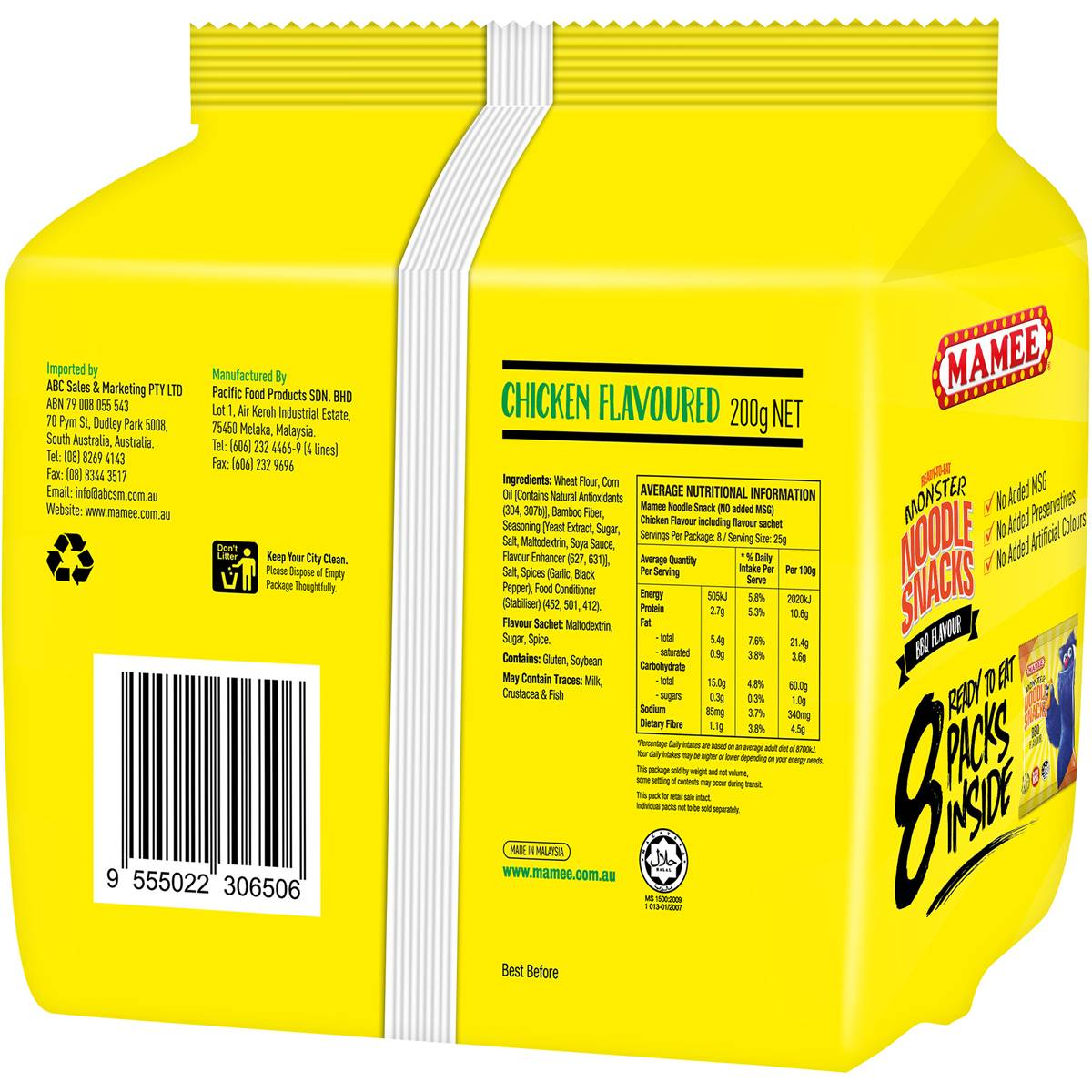 Embark on a flavorful journey with Mammee Monster Noodle Snacks Chicken Flavoured Multi Pack. This pack includes 8 individual portions of noodle snacks, each bursting with the savory goodness of chicken flavor. Crafted to provide a balance between convenience and taste, these noodle snacks are perfect for satisfying your cravings on the go or as a quick snack. Whether you’re seeking a flavorful pick-me-up or simply enjoy the convenience of portable snacks, Mammee Monster Noodle Snacks Chicken Flavoured Multi Pack brings a sense of delight and satisfaction to every bite. Embrace the umami-rich taste and enjoy the convenience of these delectable noodle snacks.