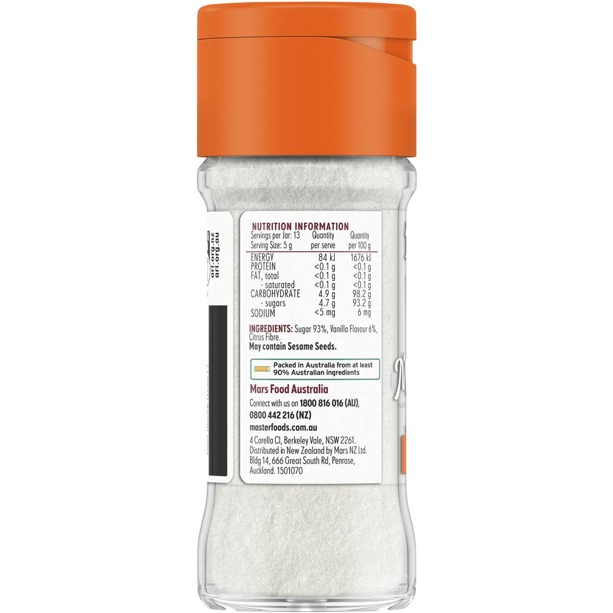 Elevate your desserts and beverages with the sweet and aromatic flavors of Masterfoods Vanillin Vanilla Sugar Seasoning. This 65g jar contains vanilla-infused sugar that adds warmth and sweetness to your culinary creations. With its versatile use, Masterfoods Vanillin Vanilla Sugar is perfect for sweetening coffee, tea, baked goods, and more. Experience the authentic and delightful essence that vanilla-infused sugar brings to your kitchen. Elevate your cooking and sipping experiences with the sweet and delicious taste that Masterfoods Vanillin Vanilla Sugar Seasoning brings to your palate.