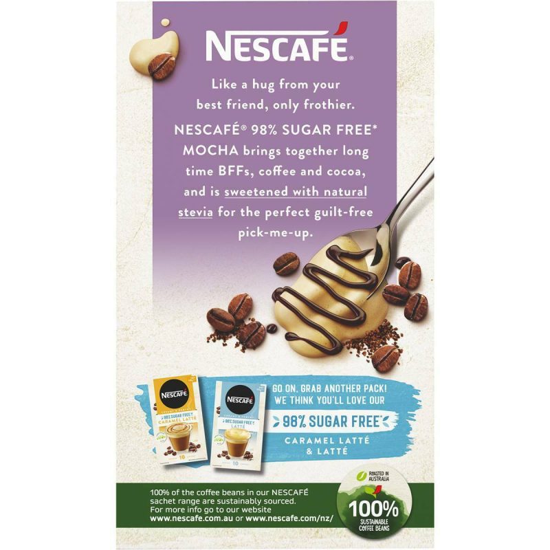 Indulge in the rich and chocolaty taste of Nescafe Coffee Sugar Free Mocha. This 10-pack contains individual sachets that are filled with a delightful blend of coffee, milk, and sugar-free mocha flavor. Simply add hot water, and you’ll have a smooth and satisfying mocha in an instant. The convenient sachets are perfect for on-the-go indulgence or for enjoying a comforting moment at home. Whether you’re starting your day or seeking a delightful pick-me-up, Nescafe Coffee Sugar Free Mocha is a perfect choice for coffee and chocolate lovers looking for a sugar-free option. Embrace the joy of coffee shop quality in the comfort of your home or wherever you go, and let Nescafe Coffee Sugar Free Mocha be your go-to treat for a delicious coffee experience without the added sugar.