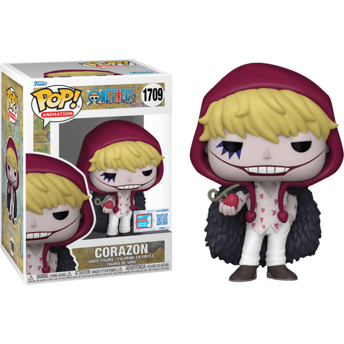 Standing at approximately 3.75 inches tall, the Corazon NYCC 2024 Pop! Vinyl is a collector’s dream and a true homage to the character’s legacy. Perfect for fans of Trafalgar Law’s moving backstory and devoted collectors seeking rare convention exclusives, this piece is a unique addition that will bring heart (literally and figuratively) to any One Piece display.