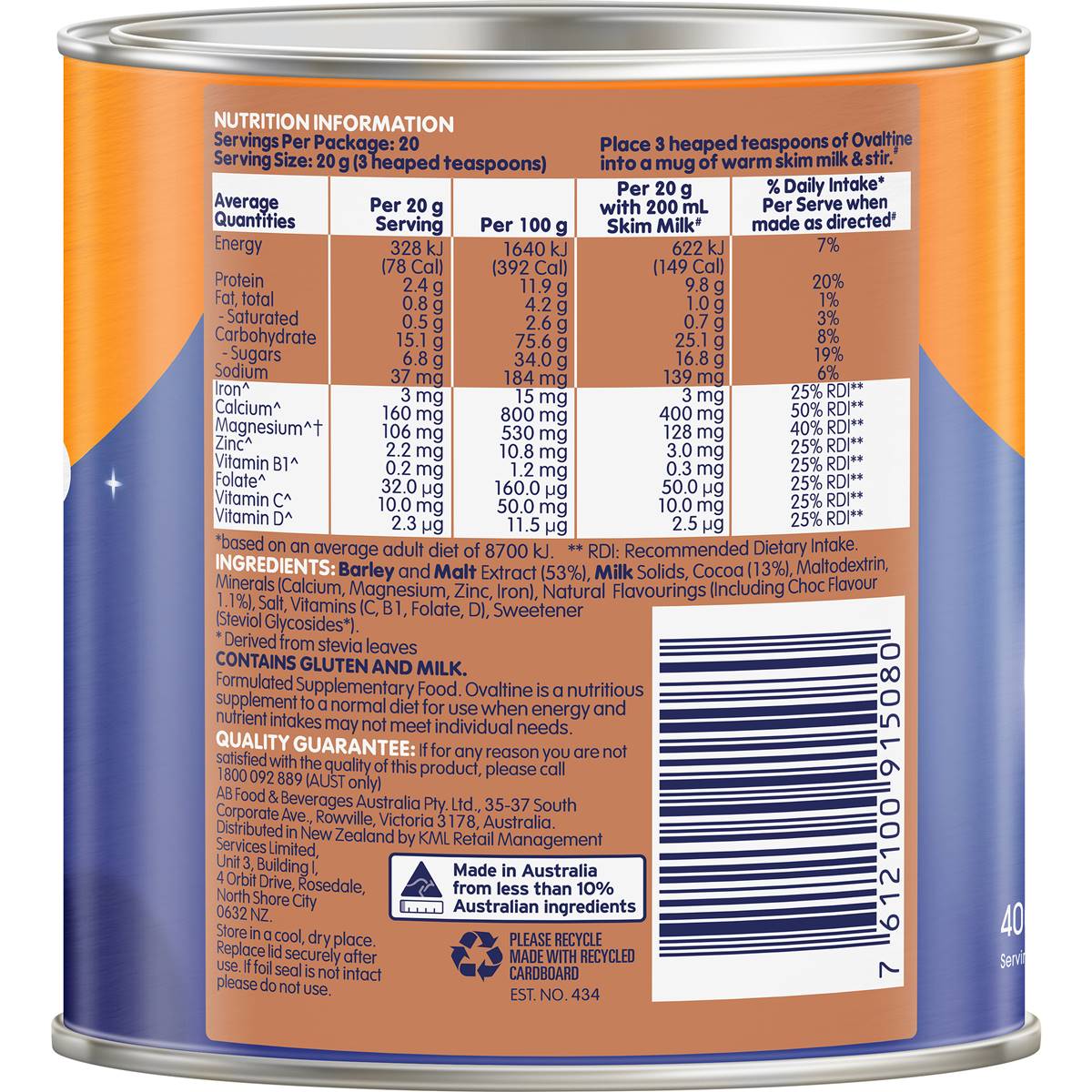Ovaltine Milk Drink Chocolate Powder Sleep Calming Choc Tub 400g