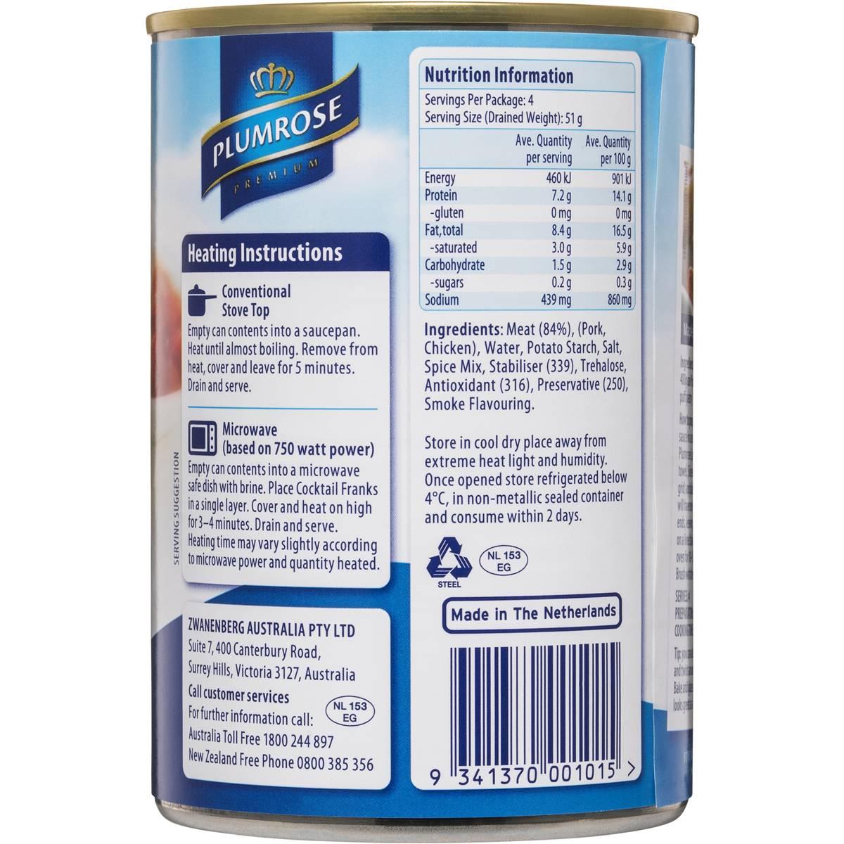 Plumrose Premium Cocktail Frankfurts Tin 400g