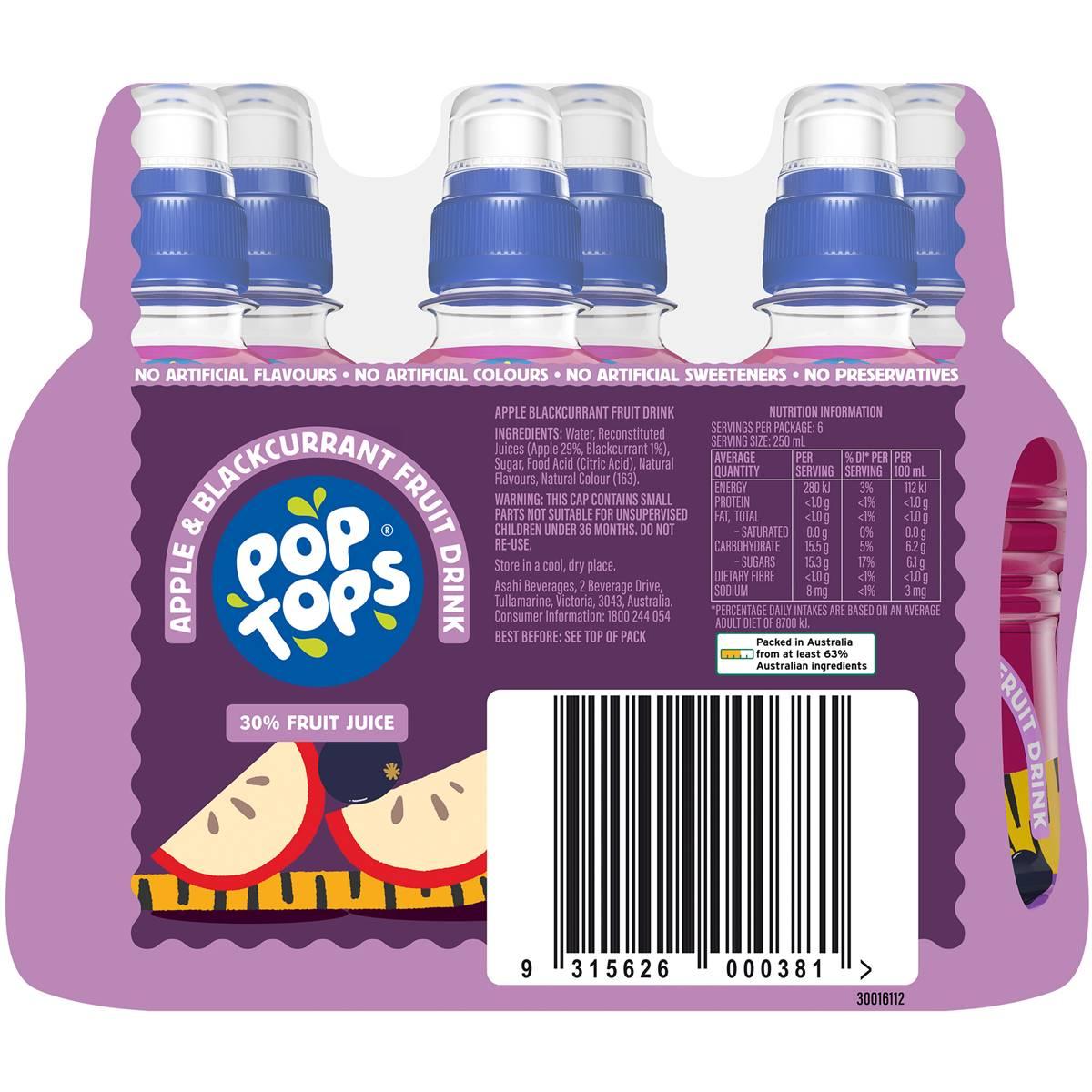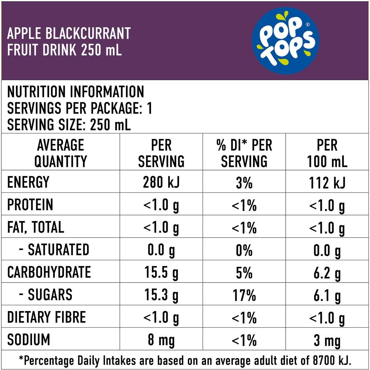 - Dynamic Apple Blackcurrant Fusion: Pop Tops Apple Blackcurrant Fruit Drink is a delightful blend of crisp apples and succulent blackcurrants. The harmonious fusion of these two flavors creates a deliciously sweet and tangy beverage that kids will love.