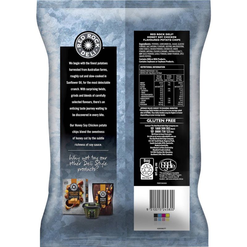 Savor the savory and sweet indulgence of Red Rock Deli Honey Soy Chicken Potato Chips. This 290g large party size bag is a fusion of flavors that combines the richness of honey and the boldness of soy chicken. Whether you’re sharing with friends, enjoying a picnic, or treating yourself, these potato chips add a touch of gourmet charm to your snacking experience. Elevate your taste buds with the culinary allure of Red Rock Deli Honey Soy Chicken Potato Chips and embark on a journey through taste.