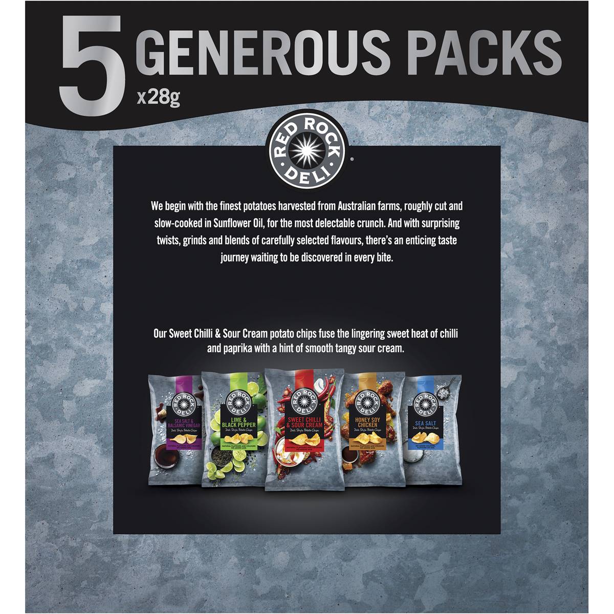 Elevate your taste buds with the dynamic flavors of Red Rock Deli Sweet Chilli Sour Cream Chips pack. This collection of 5 packs, each containing 28g of chips, offers the perfect balance of sweet and spicy in every bite. Whether you’re seeking a snack with a zesty kick or sharing moments with friends, these potato chips bring excitement to your palate. Embrace the bold and vibrant taste of Red Rock Deli Sweet Chilli Sour Cream Chips and elevate your snacking experience.