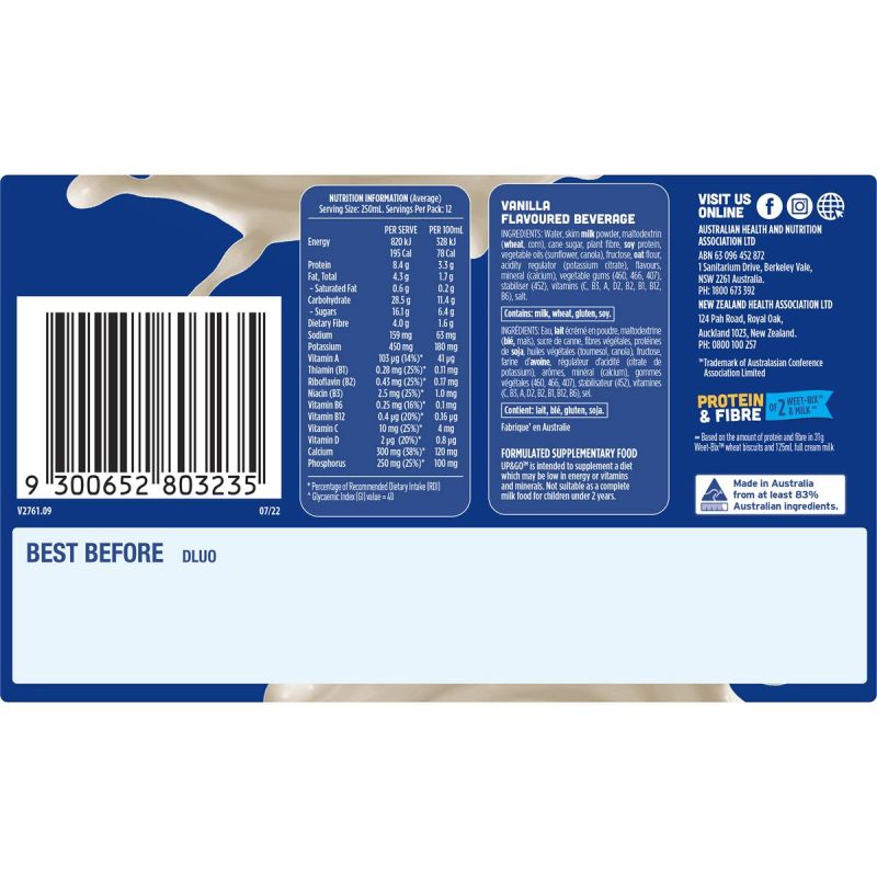 Up & Go Vanilla Milk Liquid Breakfast Cartons 250ml X 12 Cartons
