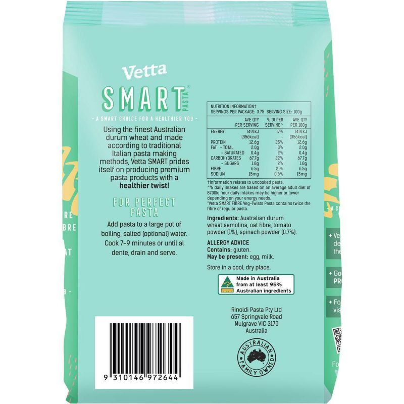 Add a nutritious twist to your pasta dishes with Vetta Smart Fibre Veg Twists Pasta. This 375g pack contains twisted pasta made with a blend of semolina, wheat fiber, and vegetable powders, offering a good source of fiber for your balanced diet. Vetta Smart Fibre Veg Twists Pasta is specially designed to be higher in fiber and contain the goodness of vegetables, making it a smart and wholesome choice for pasta enthusiasts. It cooks to perfection, maintaining its shape and texture, and pairs well with a variety of sauces and toppings. Whether you’re preparing a colorful pasta salad or a comforting pasta dish, Vetta Smart Fibre Veg Twists Pasta is a delicious and nutritious addition to your kitchen pantry. Embrace the joy of a wholesome and satisfying pasta experience, and let Vetta Smart Fibre Veg Twists Pasta be your go-to choice for creating wholesome and delicious pasta dishes.