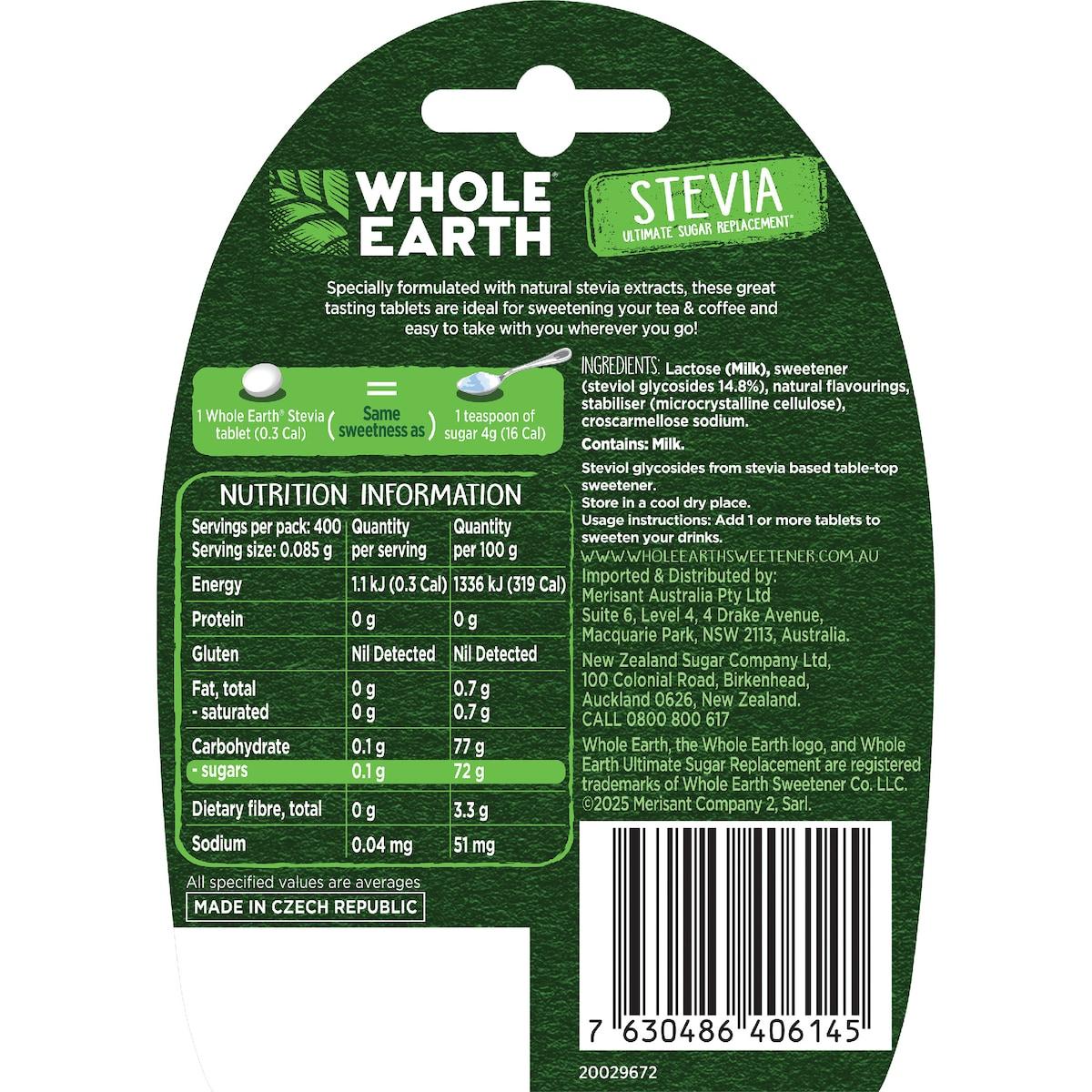 Enjoy the natural sweetness of stevia without the calories or carbs with Whole Stevia Ultimate Sugar Replacement Sweetener Tablets. Each tablet is formulated with steviol glycosides (14.8%), offering a sugar-like sweetness with just 0.3 calories per tablet .Woolworths+1Whole Earth Sweetener+1