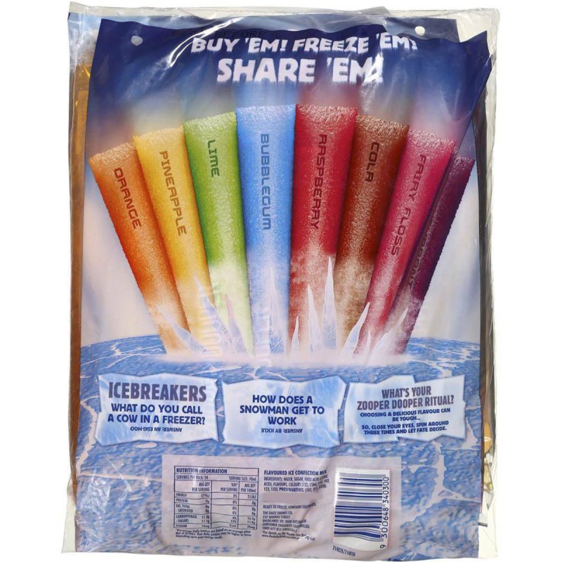Beat the heat with the cool and refreshing taste of Zooper Dooper Ice Blocks. This pack contains 24 ice blocks, each weighing 70ml. Zooper Dooper Ice Blocks are a beloved and classic choice for summer treats and picnics. With an assortment of vibrant colors and fruity flavors, including raspberry, lime, orange, and more, Zooper Dooper Ice Blocks offer a delightful and nostalgic frozen treat for both kids and adults. Whether you’re hosting a party or enjoying a sunny day outdoors, Zooper Dooper Ice Blocks are a go-to choice for moments of refreshing enjoyment. Embrace the joy of fruity and icy goodness, and let Zooper Dooper Ice Blocks be your go-to treat for beating the summer heat.